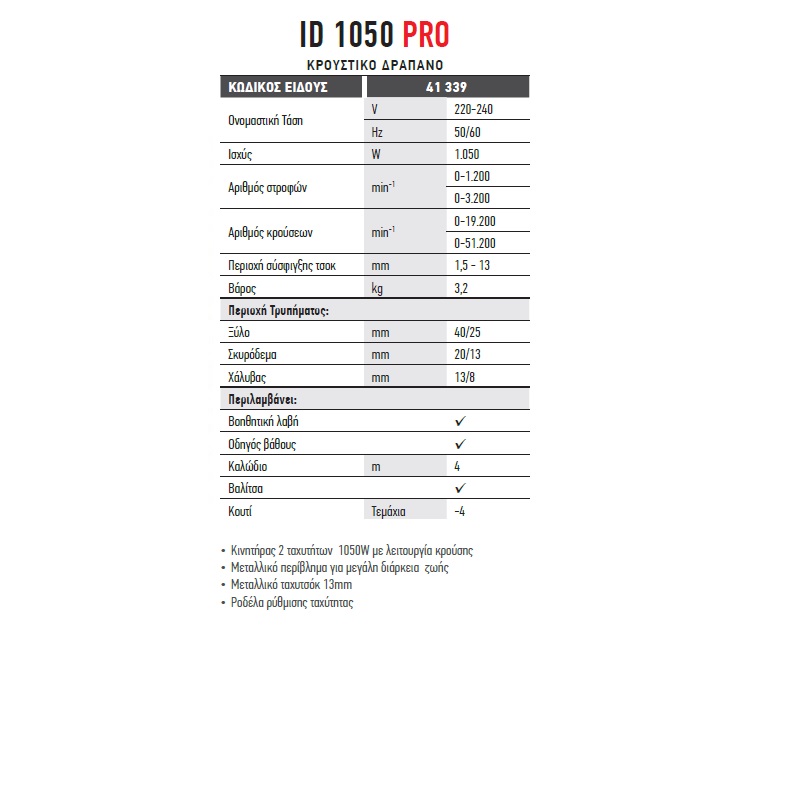 Εξοπλισμένο με μεταλλικό ταχυτσόκ 1,5-13mm.